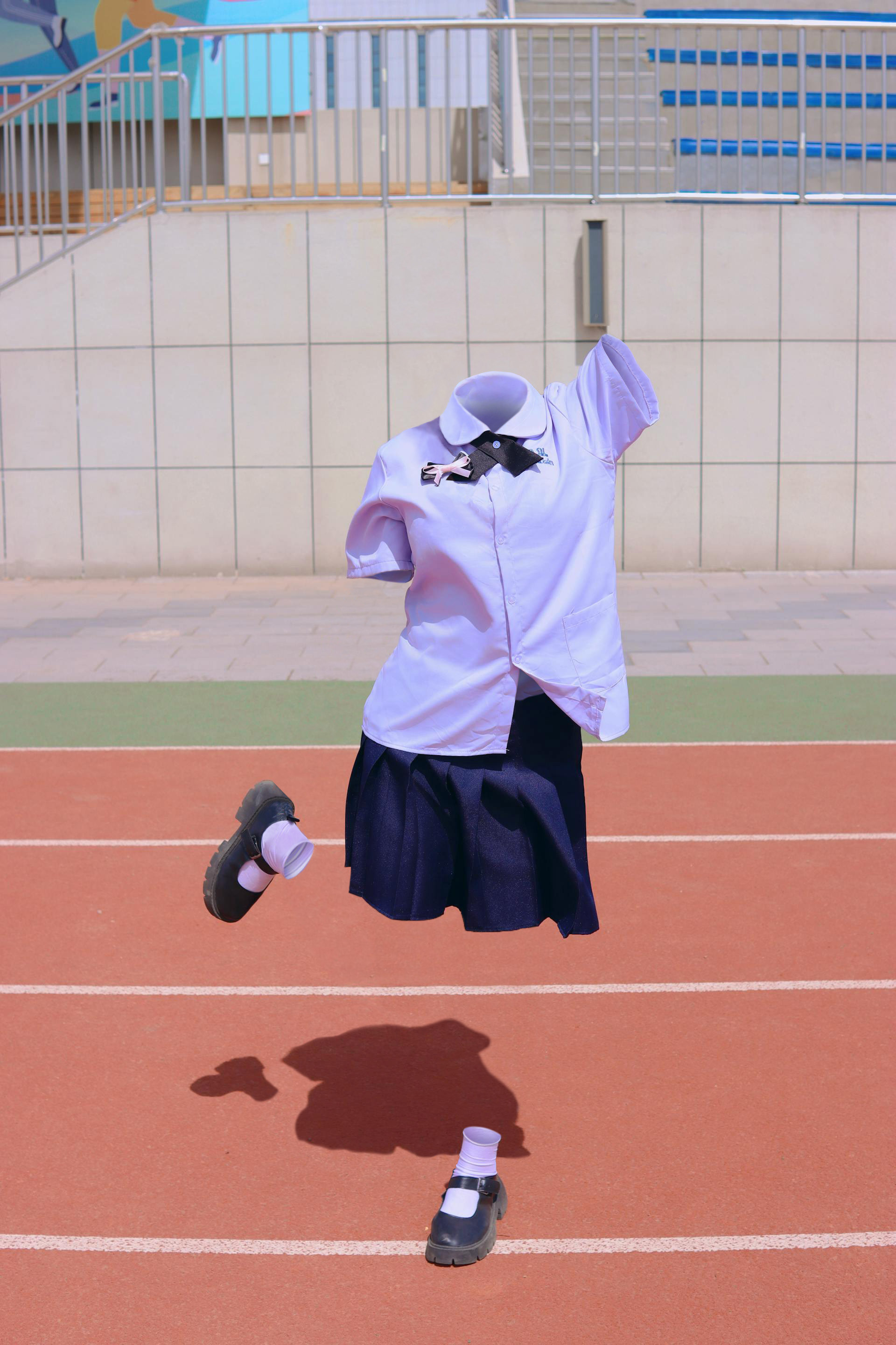 Found a picture of a girl in motion and used cloning and masking in Photoshop to remove her body and hair, leaving behind her clothing and shoes, as if she were an invisible person.
