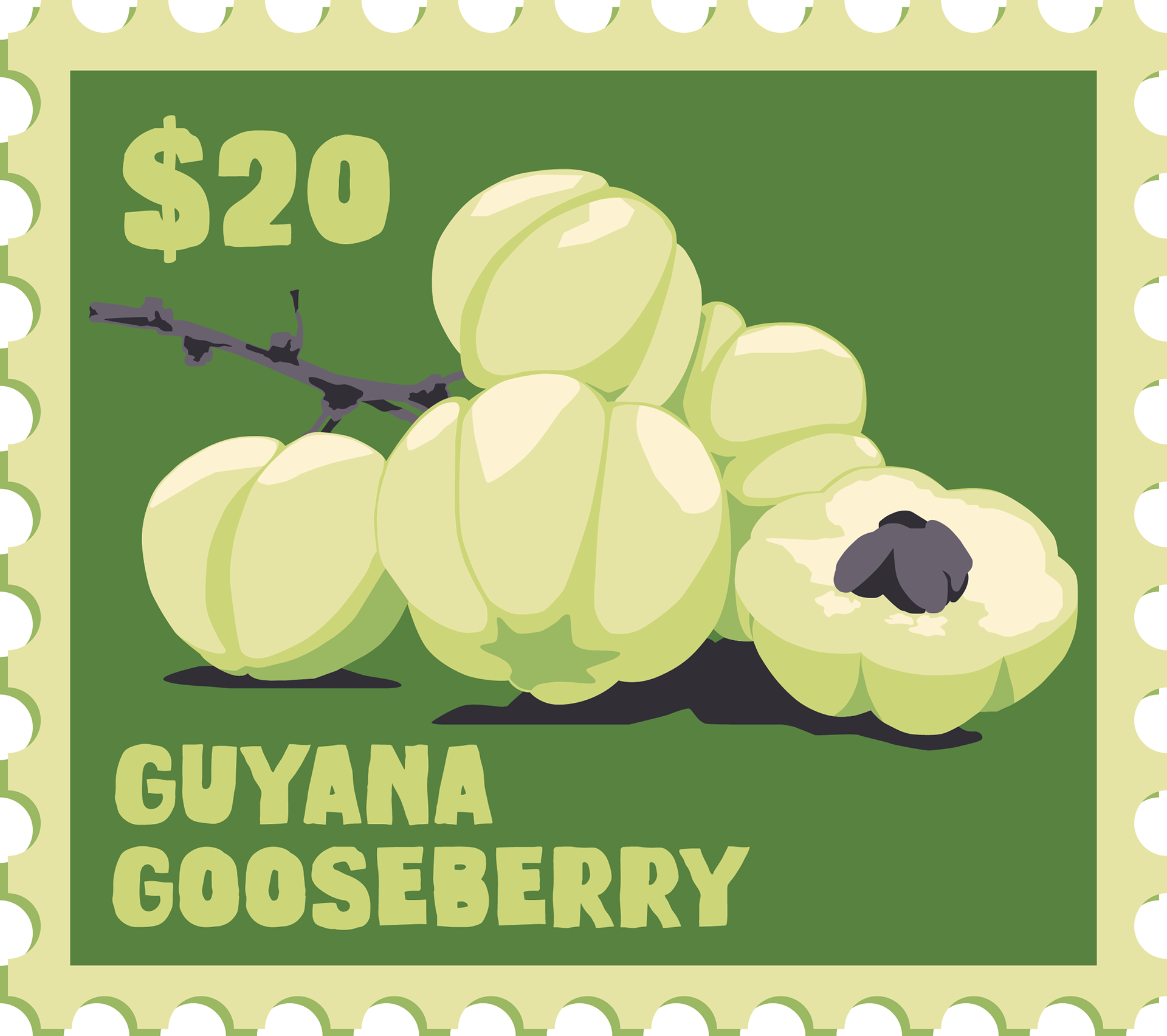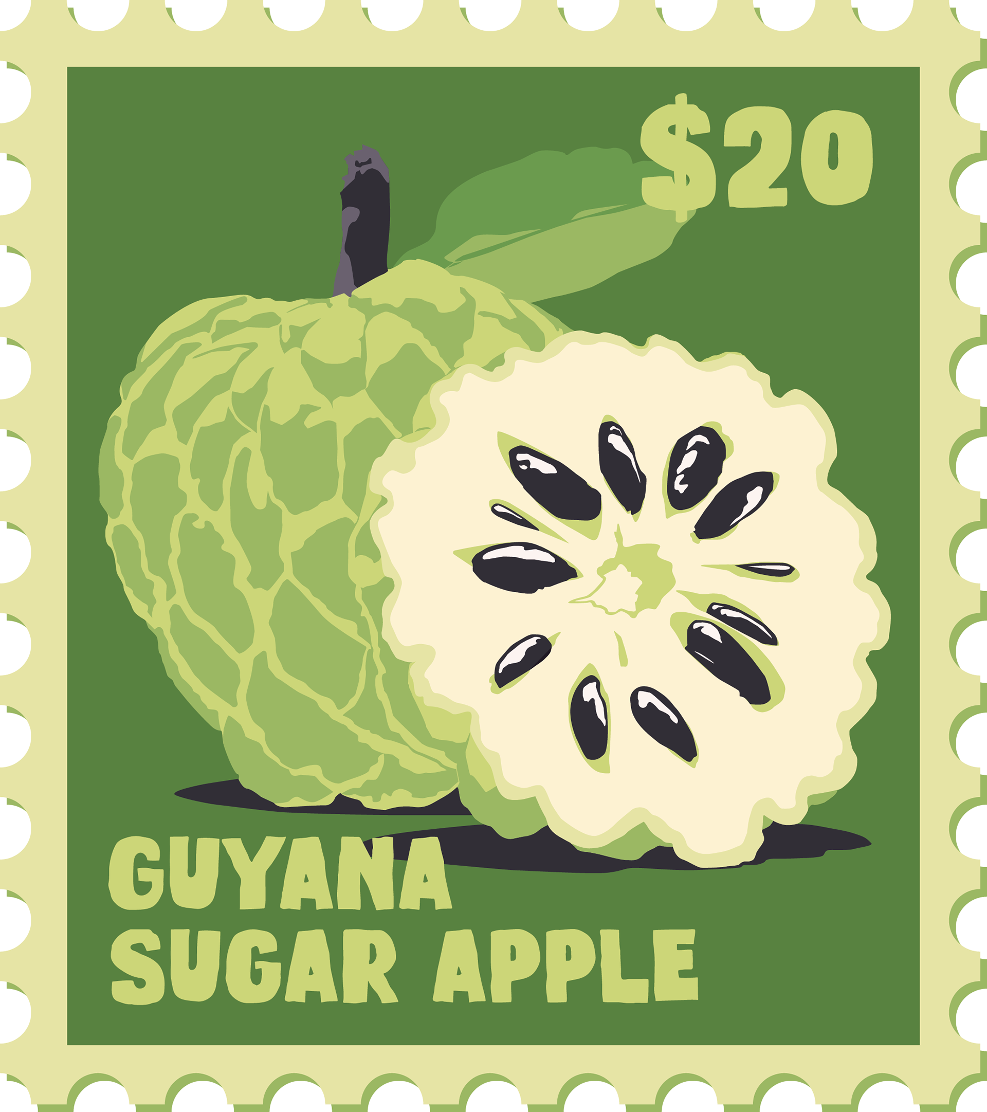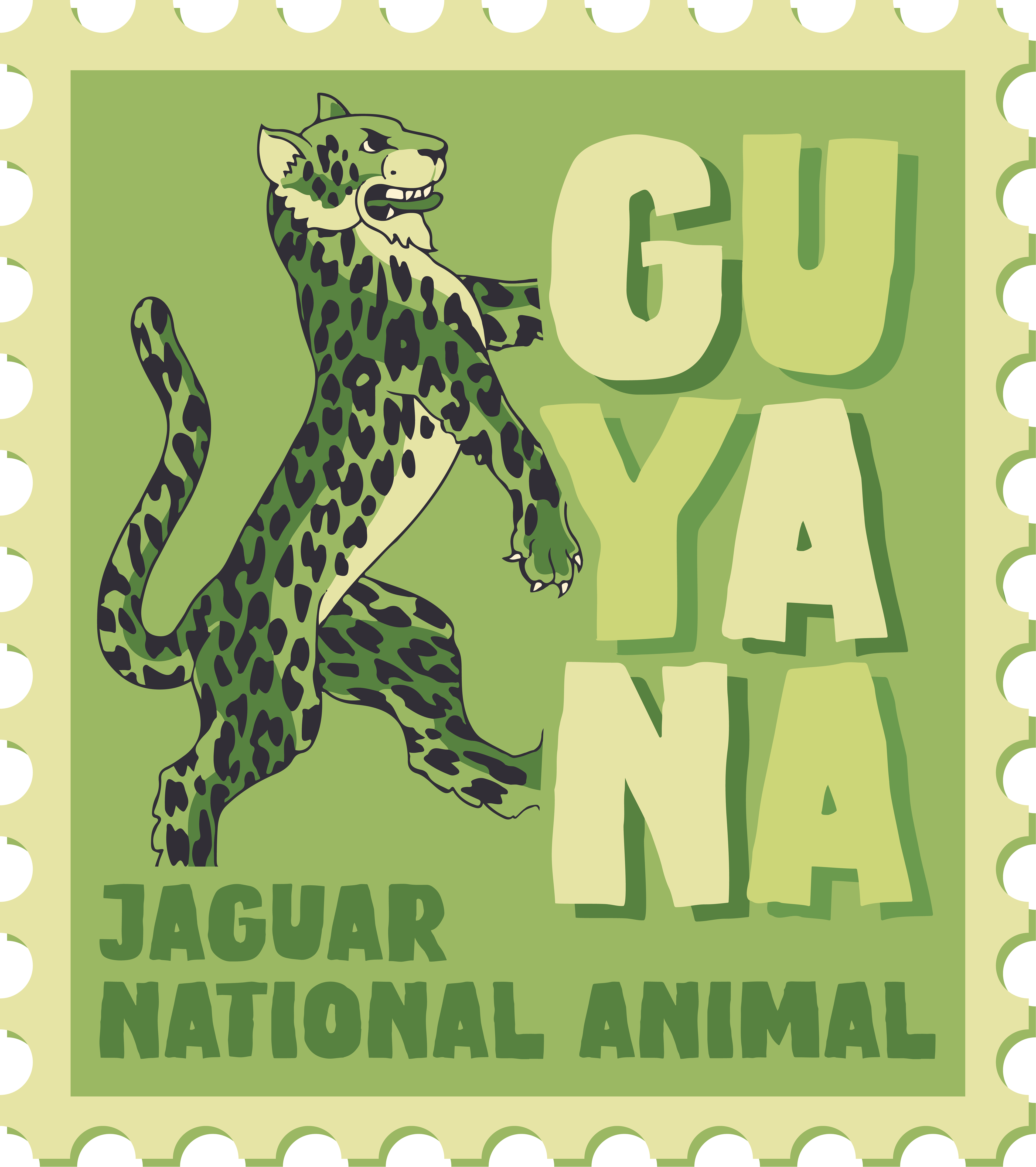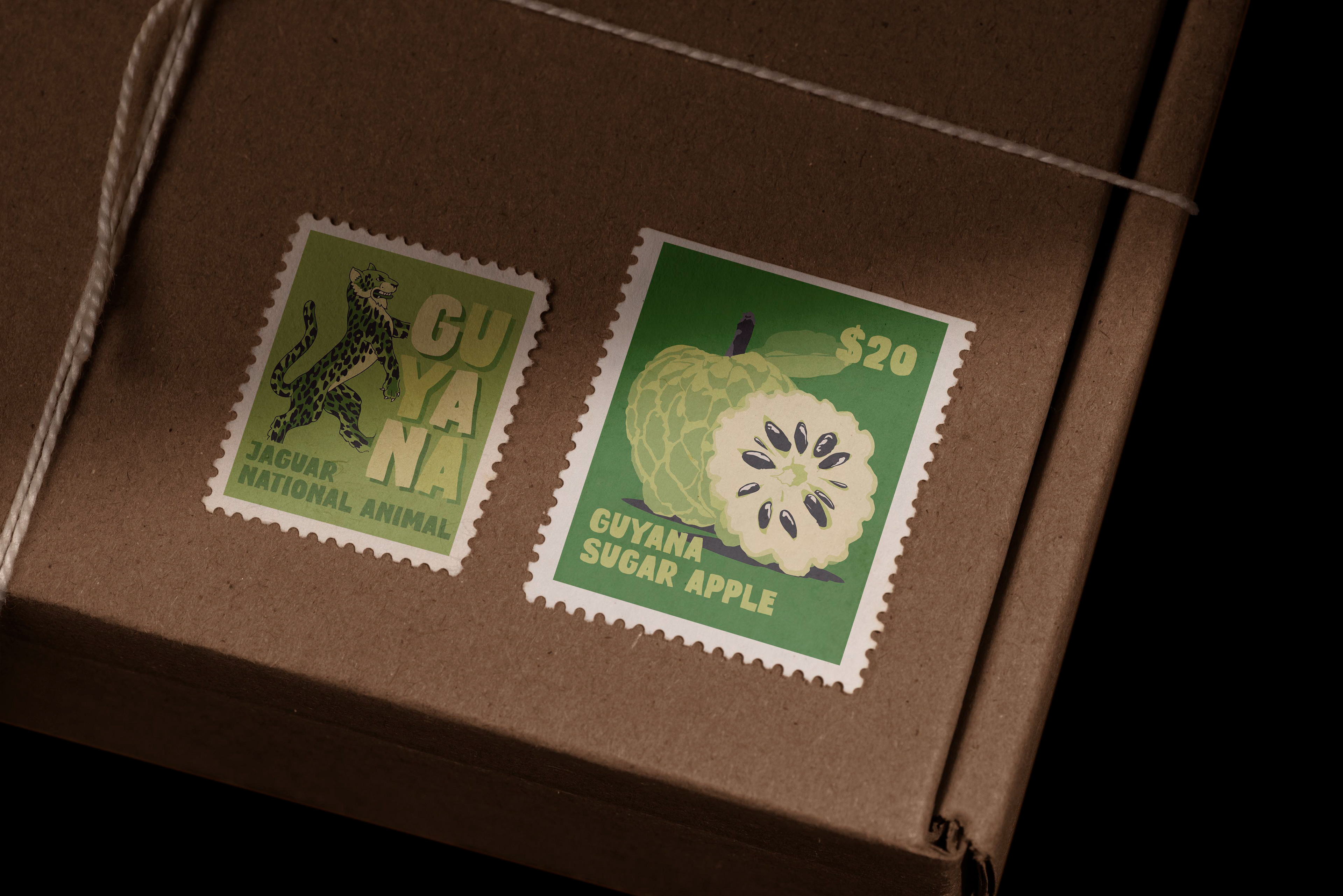 postage stamps that express citizenship for Guyana by highlighting the regional fruits, the Guyanese coat of arms, and the green colors of the jungle, since it is a South American country extremely close to the Amazon Rainforest.