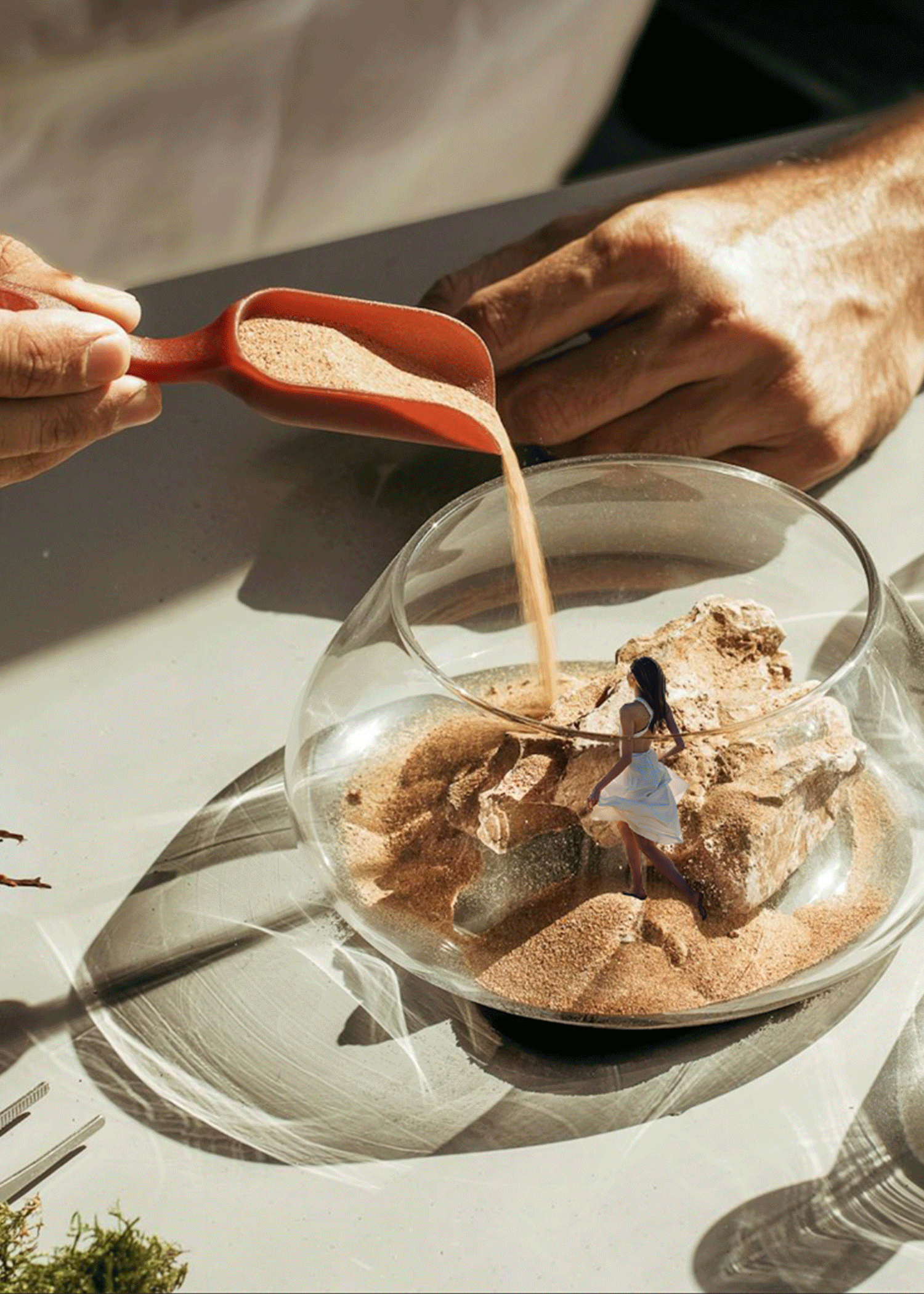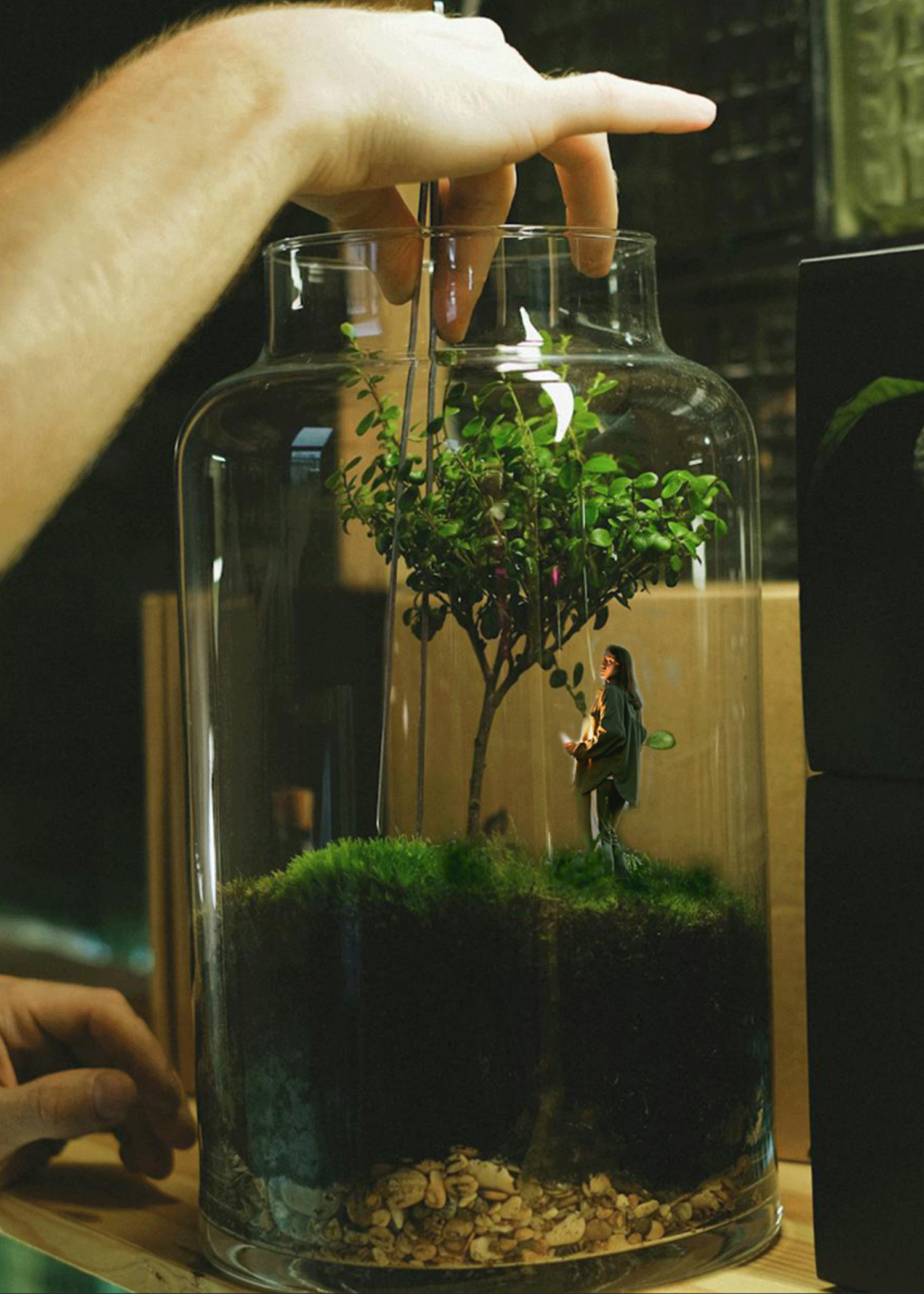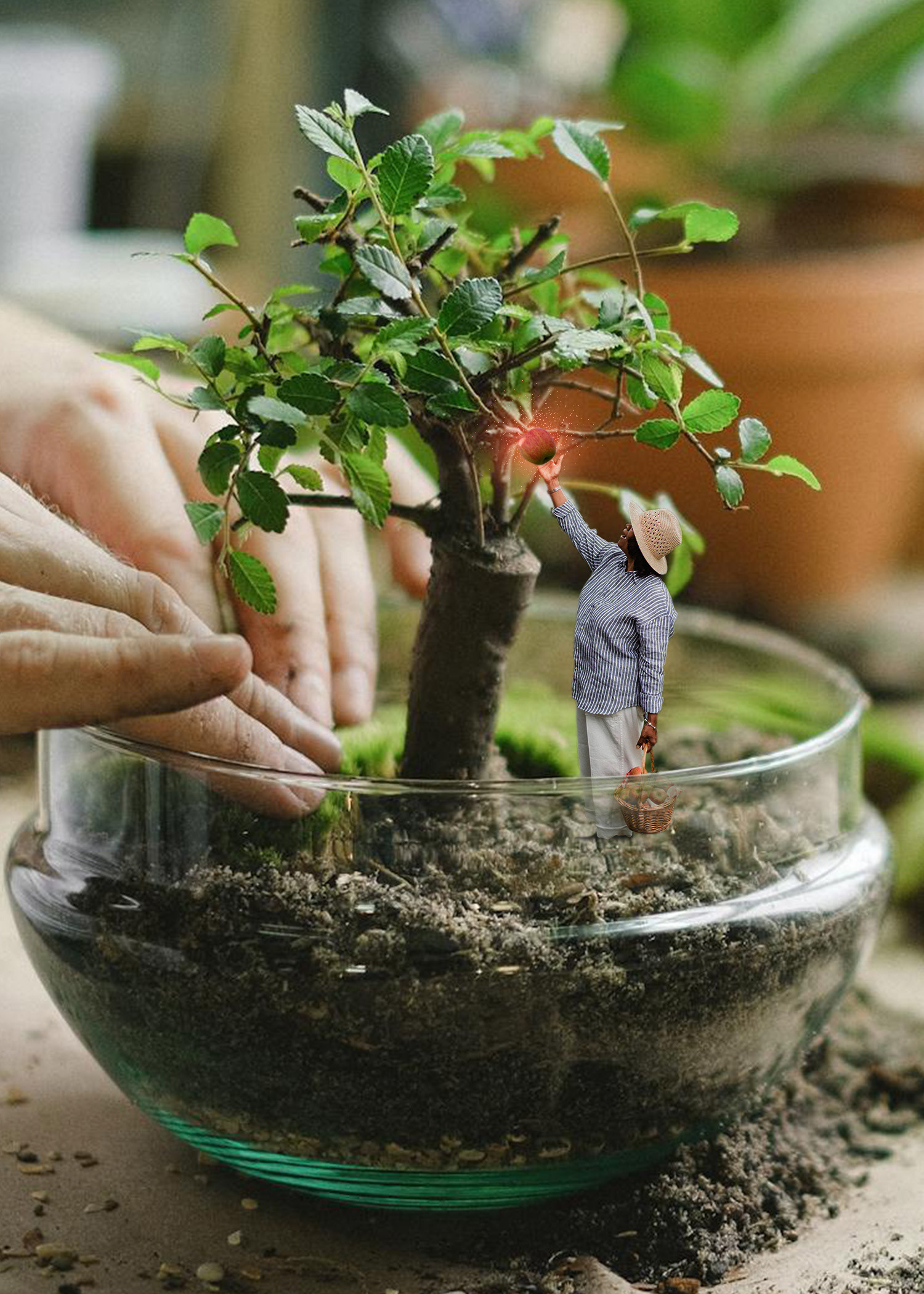 Using Photoshop, I created a series of three conceptual photo-illustrations that depict tiny/little people interacting within a terrarium-like environment that is being constructed by bigger people.
