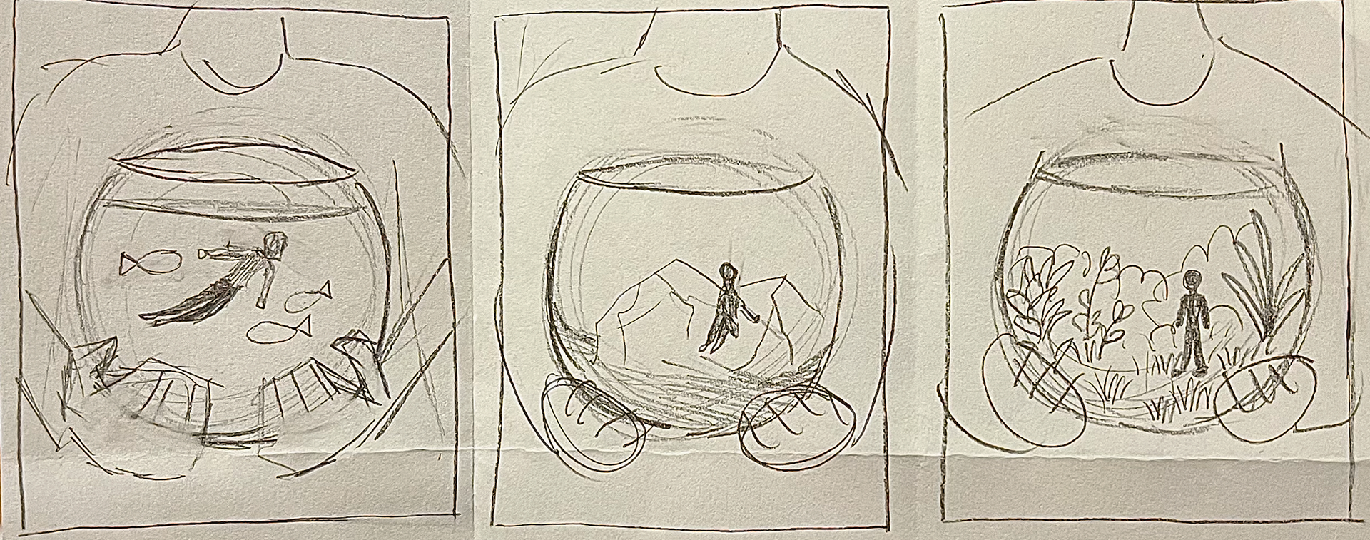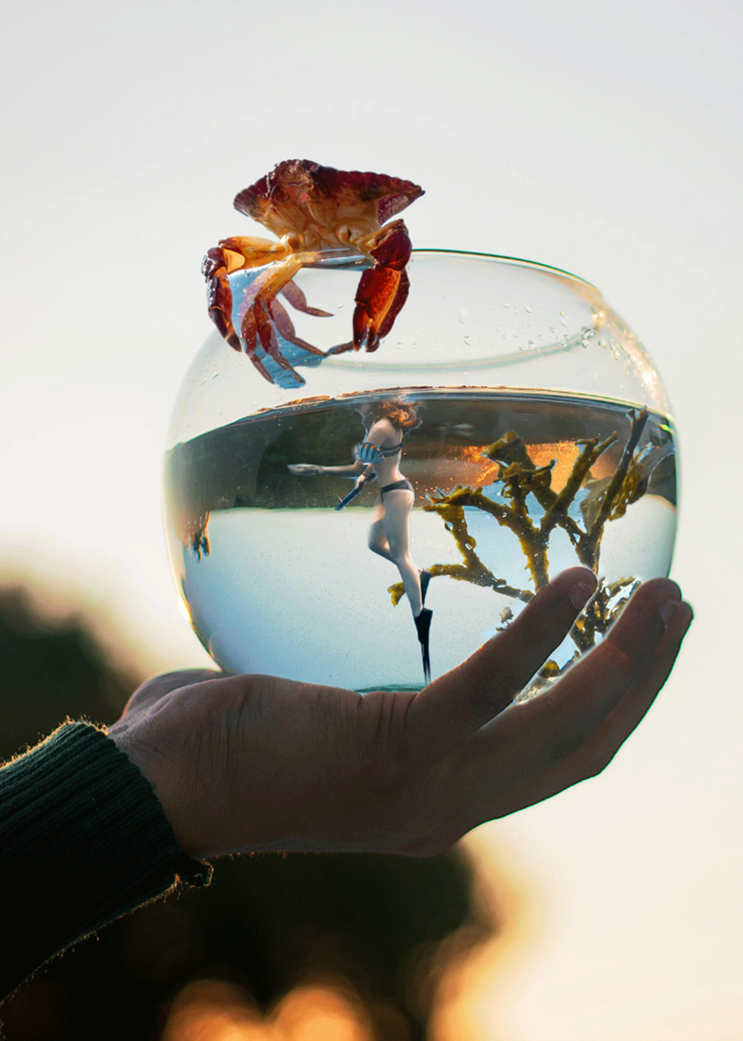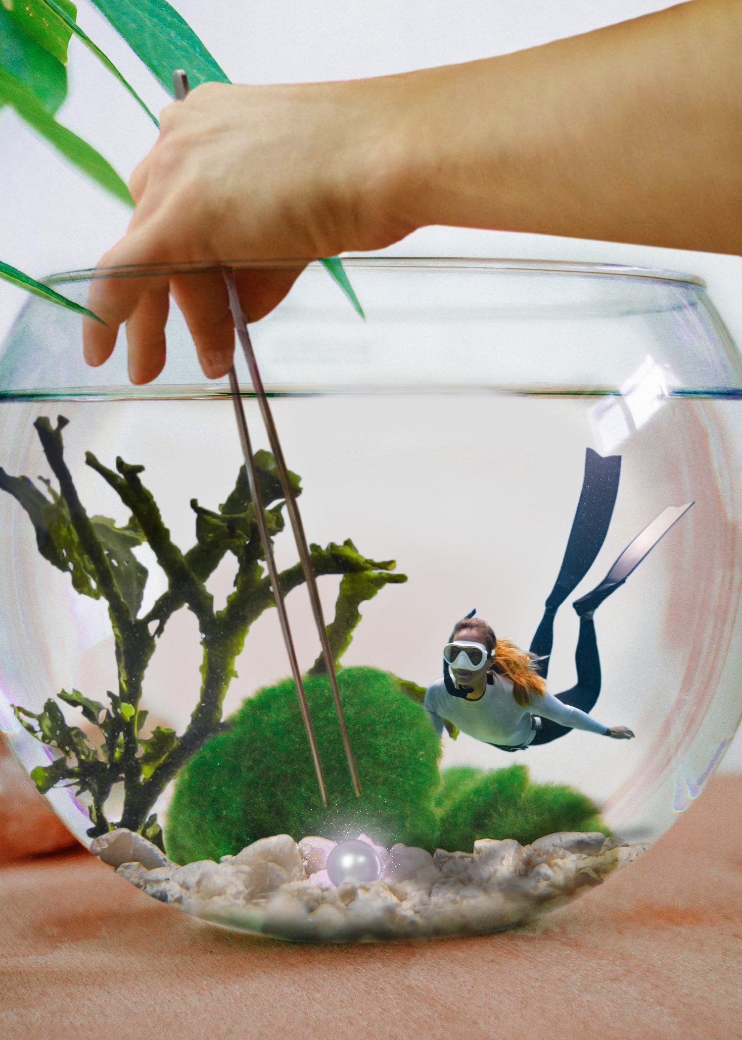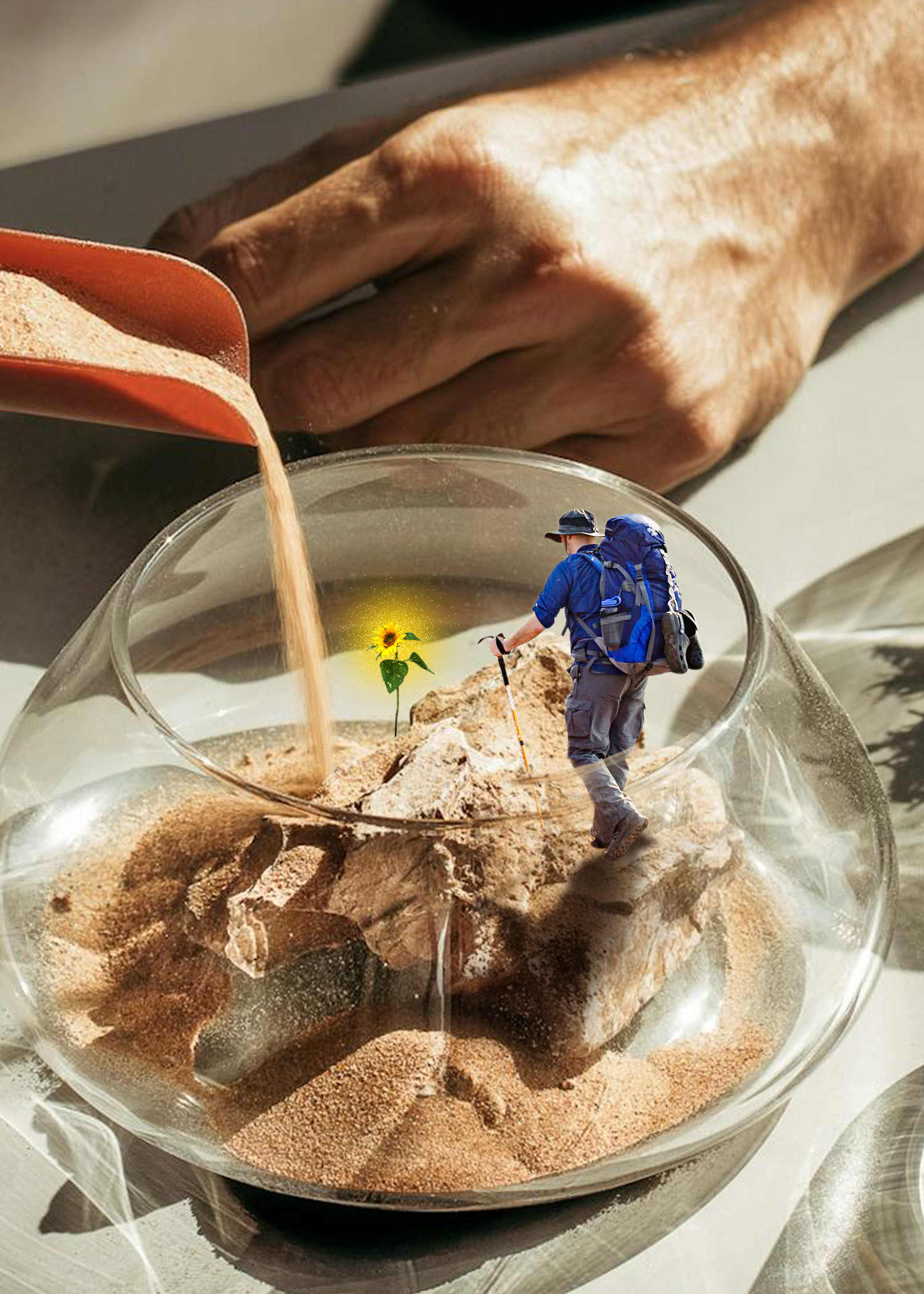 Using Photoshop, I created a series of three conceptual photo-illustrations that depict tiny/little people interacting within a terrarium-like environment that is being constructed by bigger people.